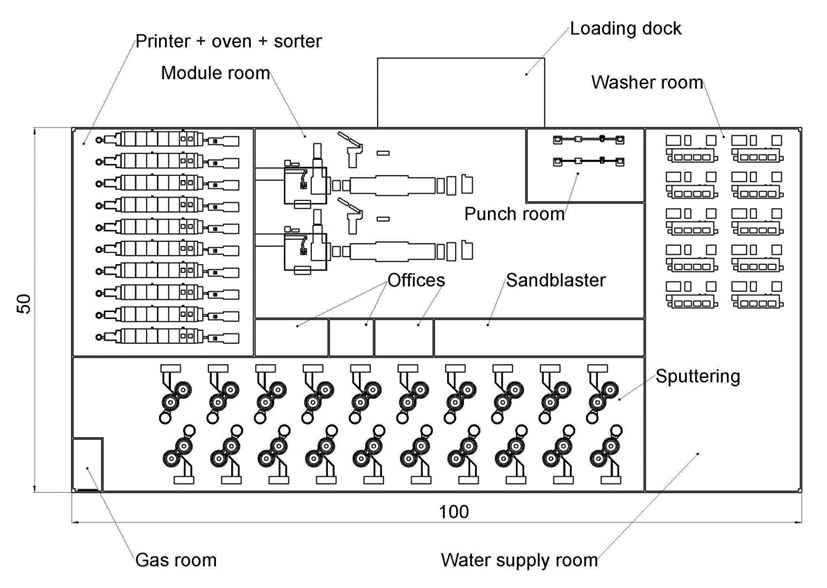 13,000m2 production area with a celling height of 3,5m (including 250sqm R&D and 6m panels that take ~700sqm extra)Â